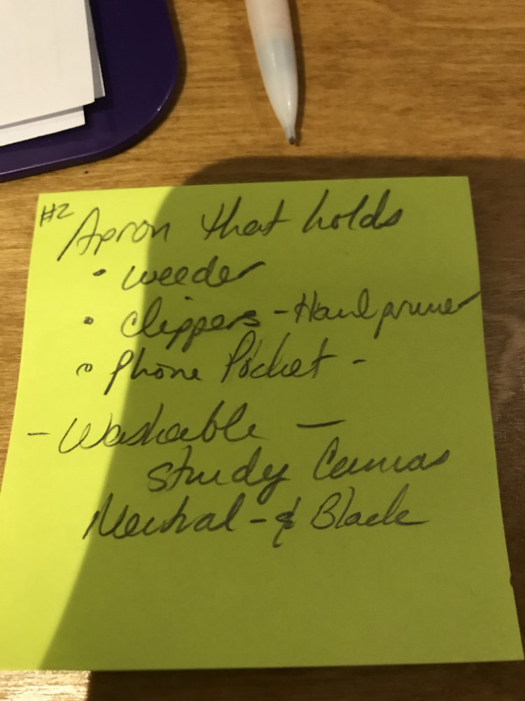 But the second one was an apron that had pockets for her garden shears, the weeder, and her phone so that she could have all three with her as she did gardening work.