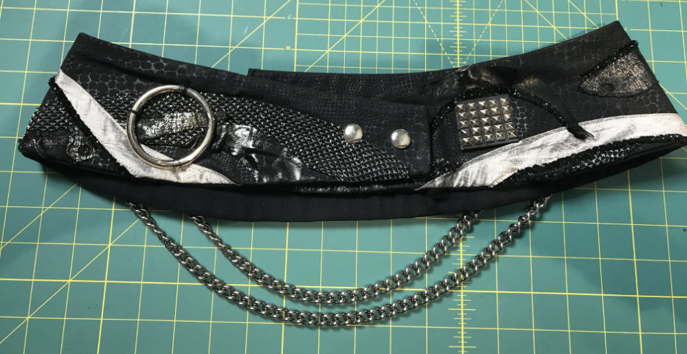 My first belt is black and silver and has a snake-skin embossed fabric as the backing fabric and has studs and dog collar chains decorating it.