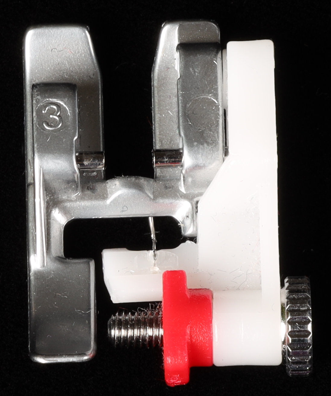 - Straight Stitch Needle Plate (and foot) - This presser plate is used when working with super light fabrics like chiffon and charmeuse satin. It helps prevent the fabric from being pushed down into the bobbin area of the machine especially when starting stitches. It's useful, not a must-have. And it's critical that if you are using this, you remember to switch back to the regular needle plate to do wider stitches like a zig-zag stitch.